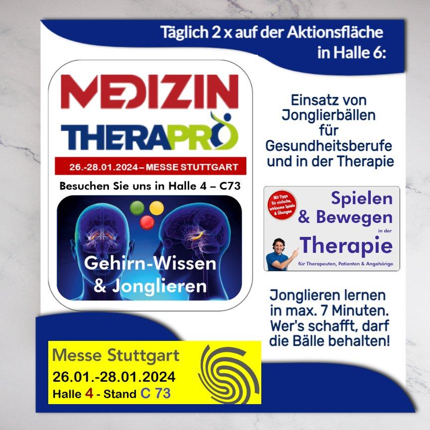 Stephan Ehlers aus München, Experte für Gehirn-Wissen & Jonglieren wird am Messestand Gehirn-Wissen & Jonglieren in Halle 4 / C73 sowie zwei Mal täglich auf der Aktionsfläche in Halle 6 (E70) den Messebesuchern erklären und selbst erleben lassen, warum das Jonglieren bzw. Wurf-/Fangübungen mit nur einem Ball bereits intensiv im Gehirn wirkt und Kognition und Koordination verbessern. Außerdem wird erklärt, wie Gesundheitsberufe einfache Wurf- und Fangübungen mit nur 1 und 2 Bällen wirksam in der Therapie einsetzen können.