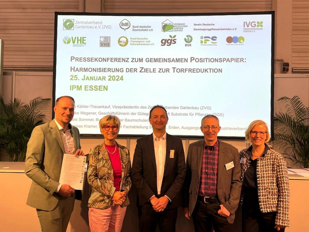 Im Rahmen der IPM ESSEN fand dazu am Donnerstag, dem 25. Januar 2024, eine gemeinsame Pressekonferenz statt. Die beteiligten Verbände, vertreten durch den Zentralverband Gartenbau (ZVG), die Gütegemeinschaft Substrate für Pflanzen (GGS), den Bund deutscher Baumschulen (BdB) e.V. und den Industrieverband Garten (IVG) e.V. stellten dort das Positionspapier vor und beantworteten Fragen.