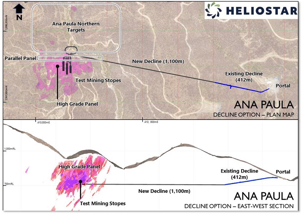 Ana Paula has a 412-metre-long decline currently completed to one third of its target length by a previous operator. Heliostar is undertaking an internal review on the potential to extend this decline to the base of the High Grade Panel to test mine a bulk sample of the deposit.