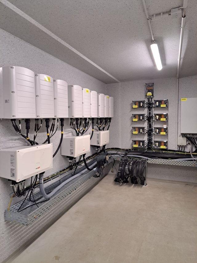 - Powertrust-Gewerbestromspeicher, mit 320 kWh Netto-Kapazität (400 kWh brutto). Bestehend aus acht Powertrust HawkTower, installiert in externem „EagleNest“. Dort sind auch die Wechselrichter installiert.
