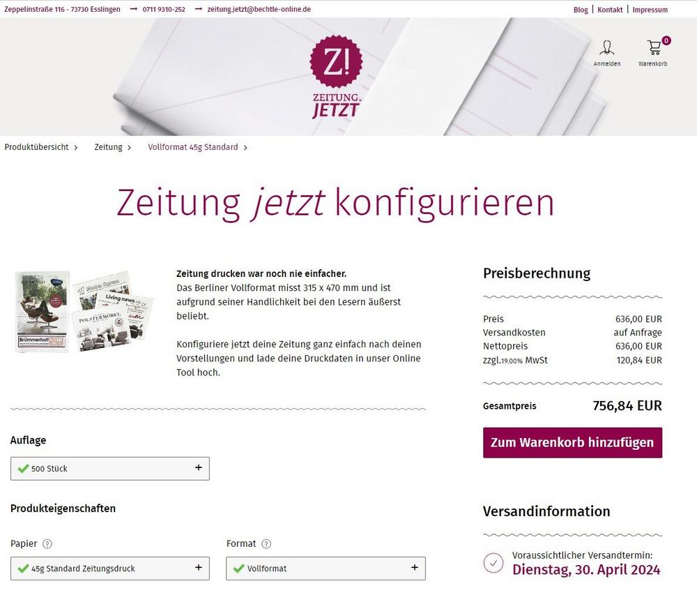 Die Plattform zeitung.jetzt hat sich auf den Druck von Zeitungen in kleineren und mittleren Auflagen spezialisiert und bietet flexible Druckoptionen im Berliner Format. Mit einem Fokus auf schnelle Lieferzeiten und hohe Qualität hat sich zeitung.jetzt als verlässlicher Partner für Event- und Unternehmenszeitungen etabliert.