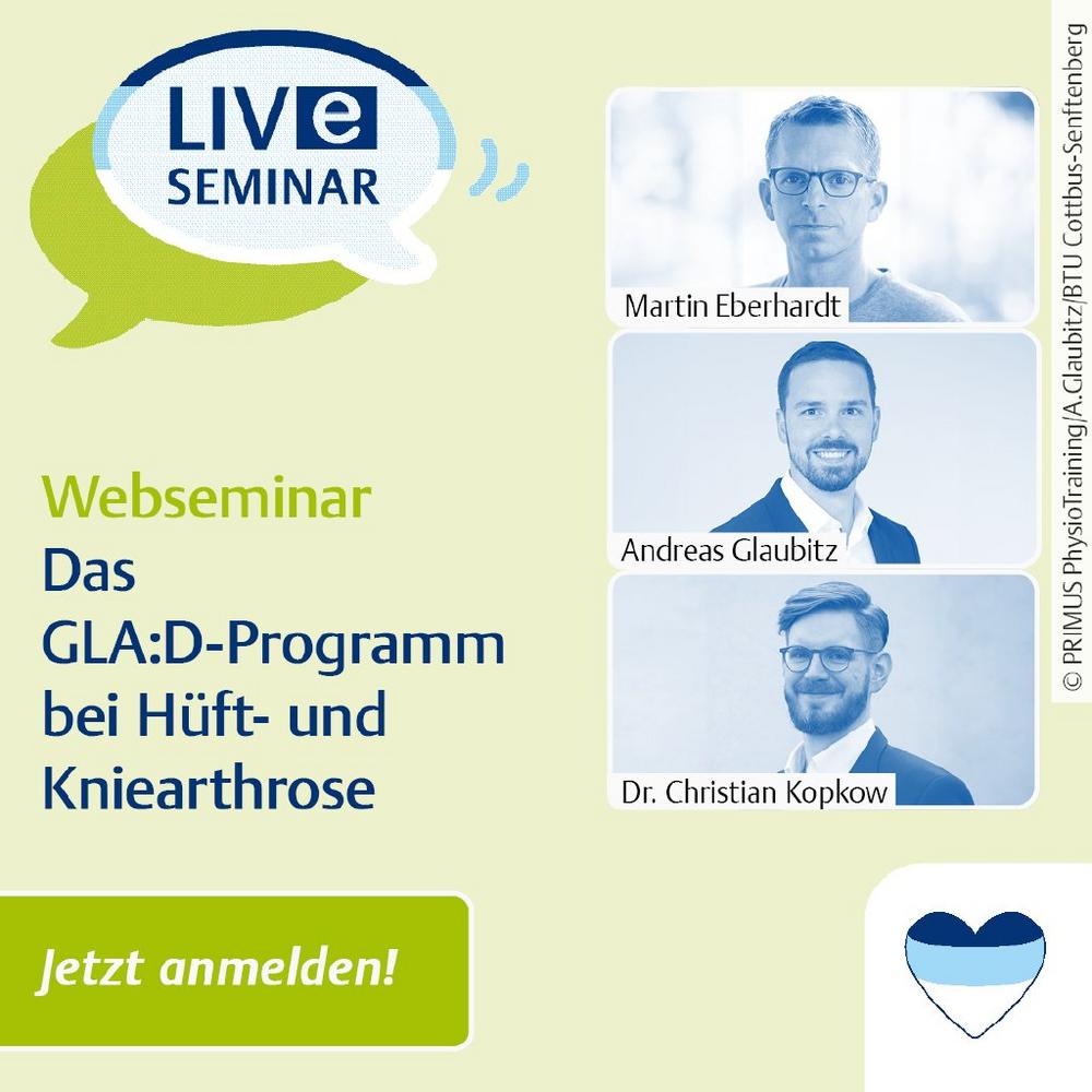 Unter dem Titel "Das GLA:D® Programm bei Knie- und Hüftarthrose" geben Projektleiter Andreas Glaubitz, wissenschaftlicher Leiter Prof. Dr. Christian Kopkow sowie Martin Eberhard von PRIMUS in Düsseldorf in diesem Webseminar Einblicke darin, wie Patient*innen von GLA:D® profitieren können, wie das Programm in Deutschland etabliert werden soll und welche Chancen es physiotherapeutischen Praxen bietet.