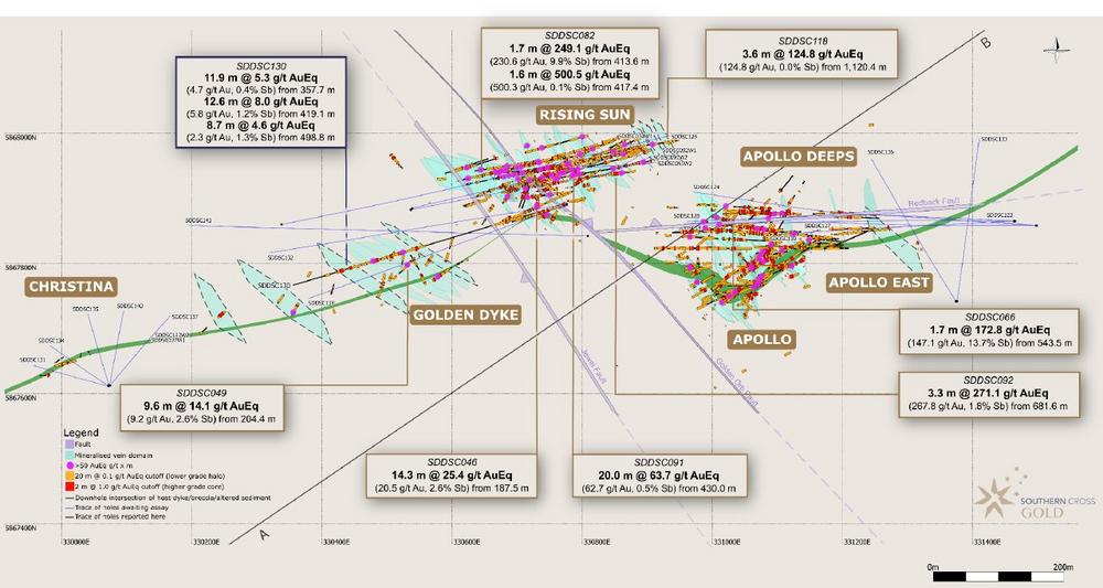 This hole occurs in the geological upper portion of the mineralized system, indicated by the presence of brittle structures, open space breccias and mineralized veins, with abundant massive stibnite occurring in quartz-carbonate veins. While the grade tenor of SDDSC130 is considered significant, analogues at Rising Sun and Apollo have shown that the tenor of gold mineralization is likely to increase with depth. SDDSC130 also provided an exceptional example of continuity and width of mineralized structures at Sunday Creek, with 11.9 m @ 5.3 g/t AuEq (4.7 g/t Au, 0.4% Sb) from 357.7 m occurring 82 m down plunge of SDDSC049 (9.6 m @ 14.1 g/t AuEq (9.2 g/t Au, 2.6% Sb) – November 8, 2022) and being interpreted as a continuous vein set.