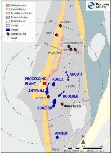 Zusätzliche Bohrungen bei Kingfisher haben das Verständnis der Mineralisierungskontrollen weiter verfeinert, wobei entlang der stark deformierten Kontaktzone zwischen einer Reihe von felsischen Intrusionen, Quarzgängen und basaltischen Einheiten eine klare Verbindung identifiziert wurde. Die Änderung der Streichrichtung entlang der Struktur von Nord-Süd nach Nord-Ost fällt mit den hochgradigeren, breiteren Mineralisierungsabschnitten zusammen. Die Mineralisierung ist durch Siliziumdioxid-Biotit-Serizit-Karbonat-Alteration und Pyritentwicklung innerhalb und neben den Quarzgängen gekennzeichnet, ähnlich wie bei den Lagerstätten Boulder und Agouti, die 1 bis 3 Kilometer weiter nördlich in derselben Sequenz und in ähnlicher struktureller Lage liegen. Diese Struktur wurde anhand von regionalen aeromagnetischen Untersuchungen identifiziert und erstreckt sich über die 32 Kilometer lange Konzession Seguela, was die regionale Aussichtslosigkeit des Projekts unterstreicht.Für den Rest des Jahres 2024 sind weitere Bohrungen mit zwei Bohrgeräten geplant, um das Streich- und Tiefenpotenzial von Kingfisher zu erweitern und Anfang 2025 eine erste abgeleitete Ressource zu erhalten.