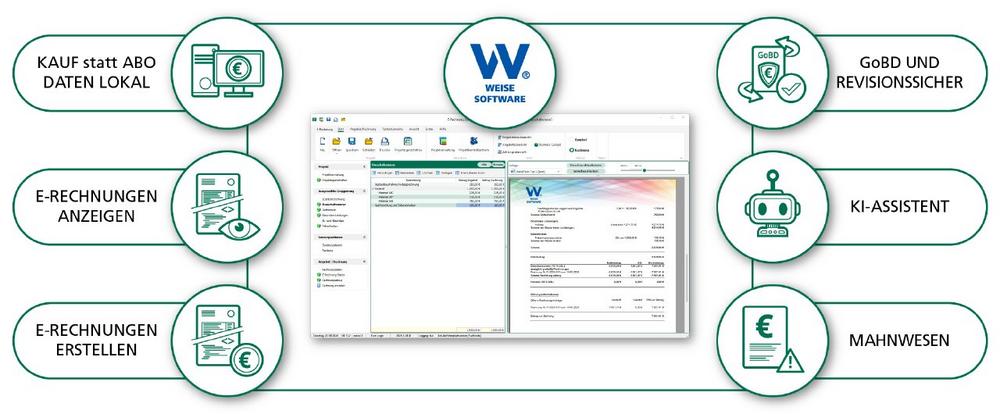 Im Funktionsumfang der Software enthalten sind neben Zu- und Abschlägen, besonderen Leistungen, Rundungen, Nebenkosten oder Sonderpositionen auch das Mahnwesen, eine Adressdatenbank, Stundenzettel zur Zeiterfassung, die Angebotserstellung, eine Zahlungsübersicht sowie eine GoBD/Steuerberater-Schnittstelle. Damit vereinfacht E-Rechnung 2025 auch die Rechnungsablage und Archivierung nach den Grundsätzen zur ordnungsmäßigen Führung und Aufbewahrung von Büchern, Aufzeichnungen und Unterlagen in elektronischer Form sowie zum Datenzugriff (GoBD). Zu den weiteren Funktionen gehören ein Business-Cockpit mit einer Übersicht wichtiger Rechnungs- und Angebotsdaten, eine Textvorlagenverwaltung für Verträge und Anschreiben, ein Vorlageneditor für die Angebots-/Rechnungsvorlagen, automatische Rechnungsnummern, einen E-Mail-Versand sowie Abschlags- und Sammelrechnungen. Damit verfügt E-Rechnung 2025 neben dem wichtigen X-Rechnungsdaten-Export und -Import über alle wichtigen Funktionen rund um die Abrechnung und Verwaltung von Zeit- und Pauschalpositionen. Über das Programm E-Rechnung 2025 hinaus bietet Weise Software mit Programmen für die Zeiterfassung, das Dokumentenmanagement, Kundenmanagement oder eine Software zur Erstellung von Checklisten weitere, ineinandergreifende Lösungen aus einer Hand.
