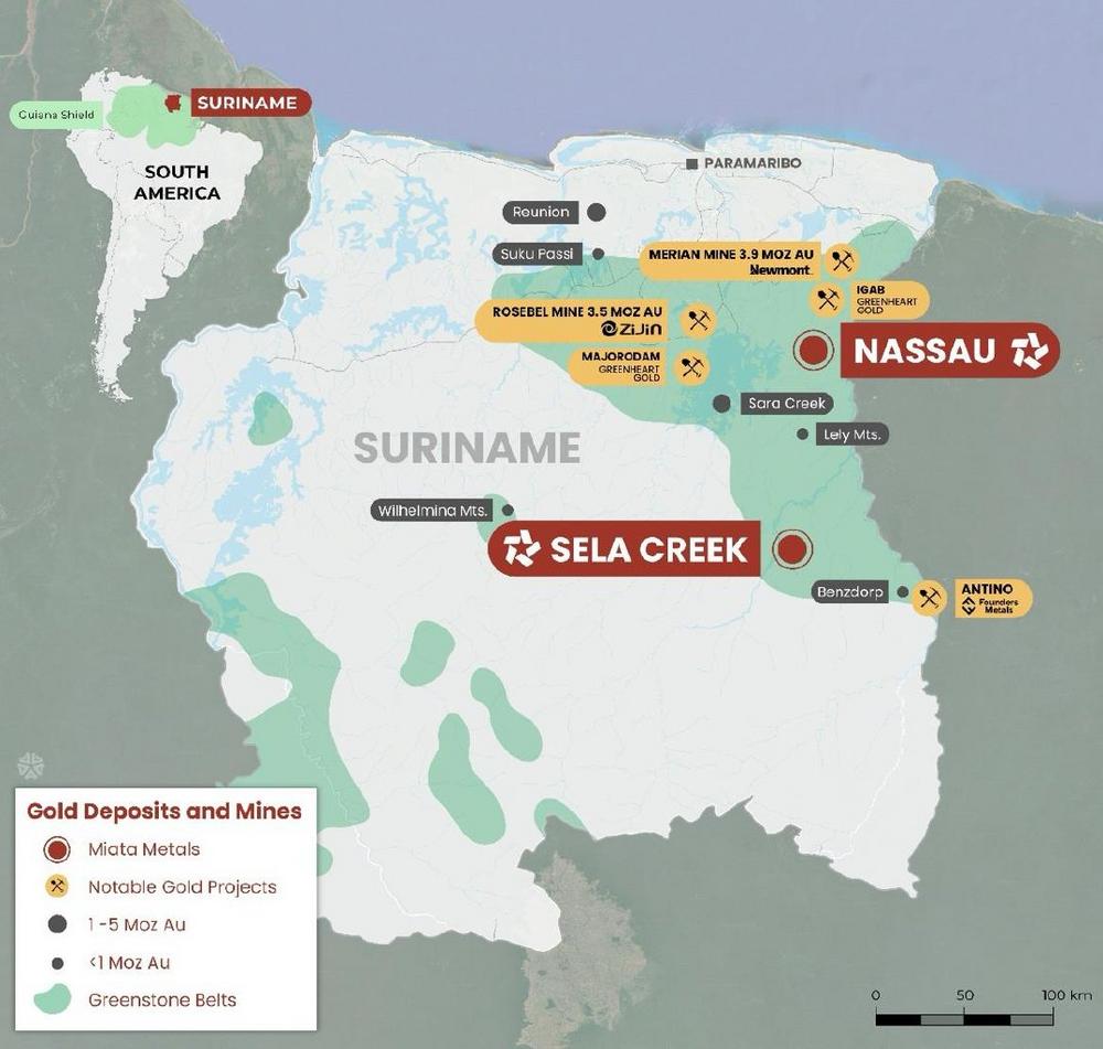 Im Zusammenhang mit der Transaktion hält Miata nun eine 70%ige Beteiligung am 21.929 ha großen Goldprojekt Sela Creek ("Sela Creek"), mit einer Option auf den Erwerb von 100%, wie in einer Pressemitteilung des Unternehmens am 26. August 2024 bekannt gegeben wurde, sowie eine 70%ige Beteiligung am 19.916 ha großen Goldprojekt Nassau ("Nassau"). Nassau-Goldprojekt ("Nassau"), die beide in Suriname, Südamerika, liegen. Sela Creek und Nassau befinden sich beide auf dem Guayana-Schild, in einer Region, die in letzter Zeit beträchtliche Investitionen in Goldexplorationen angezogen hat. Zu den anderen Unternehmen, die in Surinam tätig sind, gehören Founders Metals* (TSXV: FDR, OTCQX: FDMIF, FSE: 9DL0) (das Goldprojekt Antino), Newmont Corporation*, Zijin Mining* und Greenheart Gold*.