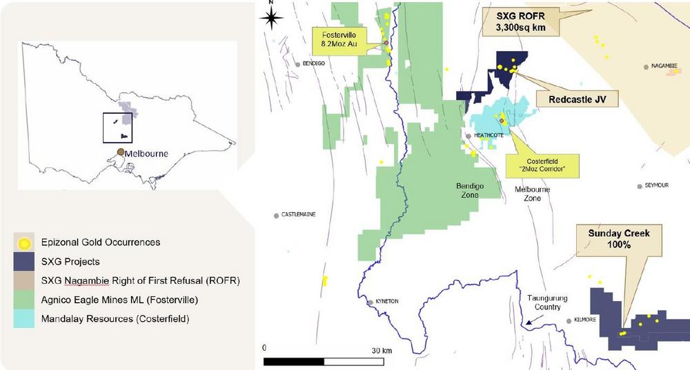 · The Redcastle gold-antimony project is located in the heart of Victoria’s Goldfields, approximately 120 km north of Melbourne. Redcastle is an historically significant goldfield, with high-grade gold production dating back to the 1850s with 17 km of undrilled reef systems that remain to be explored to depth. SXG remains focussed on the 100% Sunday Creek project, while the transaction provides full ownership and control of the Redcastle project.