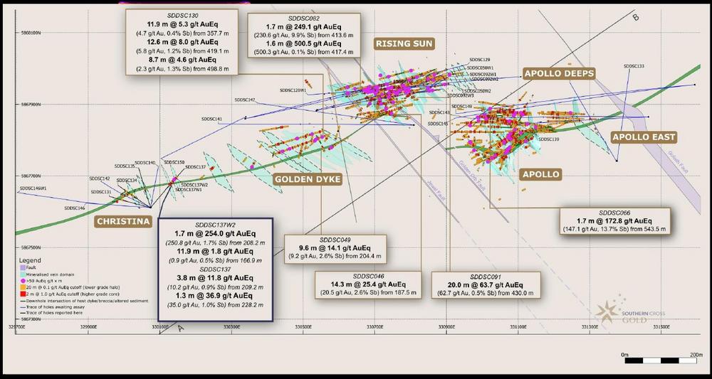 Results from six diamond drill holes (Figures 1 and 2) materially improve the prospectivity of Sunday Creek demonstrating that Christina has become the fourth high-grade gold-antimony prospect located 840 m, 480 m and 320 m west respectively from Apollo, Rising Sun and Golden Dyke.