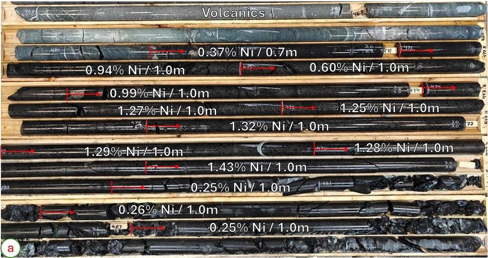 Die Ergebnisse der Untersuchungen der hochgradigen Nickelmineralisierung, die in Bohrloch BAN24-20 identifiziert wurden, weisen auf bis zu 1,32 % Nickel auf 4,4 Metern innerhalb einer gut mineralisierten Zone mit 0,80 % Nickel auf einer Bohrlochlänge von 15,7 Metern hin. (Abbildung 1a). Das Bohrloch BAN24-20 durchteufte das BHEM-Ziel in 470 Metern Bohrlochtiefe (innerhalb von 20 Metern vom interpretierten Standort) innerhalb eines stark serpentinisierten Peridotits, der netzartig strukturierte bis lokal halbmassive Sulfide enthält. Der stark mineralisierte Peridotit weist eine Kernlänge von etwa 10,1 Metern auf und wird bis zum Ende des Bohrlochs von stark serpentinisiertem Peridotit mit vereinzelter Nickelmineralisierung gefolgt.