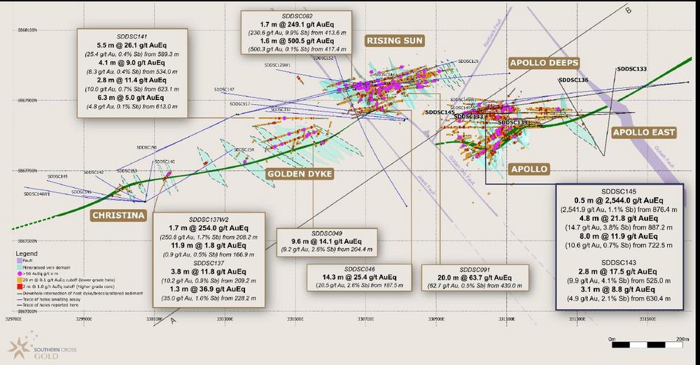 Das Bohrloch SDDSC139, das ursprünglich zur Erweiterung der Adersätze bei Apollo East vorgesehen war, wich von seiner geplanten Flugbahn ab und konnte die ursprüngliche Zielposition nicht durchschneiden. Während das Bohrloch vier mineralisierte Zonen durchteufte, erzielte nur eine davon signifikante Gehalte – der Adersatz A130, der 1,1 m mit 19,2 g/t AuEq ergab. Das Bohrloch enthielt drei Abschnitte mit >10 g/t Au (bis zu 77,5 g/t Au) und drei Abschnitte mit >5% Sb (bis zu 7,36% Sb). Zu den erweiterten Highlights gehören: