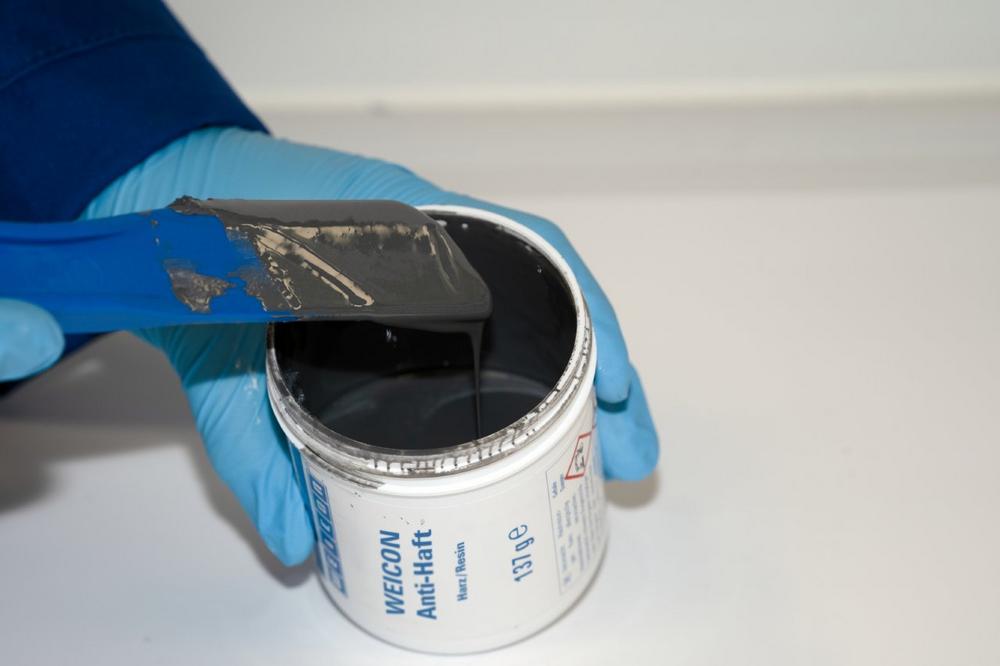 Dabei handelt es sich um ein flüssiges, graues 2-K Epoxidharz-System mit mineralischen Füllstoffen zum Schutz von stark beanspruchten Oberflächen gegenüber aggressiven Chemikalien und Korrosion. Es wurde speziell für die Verarbeitung mit einer Niederdruckanlage entwickelt. Zusätzlich zu den mineralischen Füllstoffen enthält Anti-Haft spezielle Additive, die einen Anti-Stick-Effekt bewirken und damit das Anhaften von beispielsweise Mehl, Staub oder Schwebeteilchen verhindern.