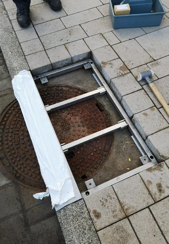 Auf individuelle Lösungen setzt auch das Abwasserwerk Frankenberg. Hier wurde beispielweise um unterschiedliche Höhen und Ausführungen der Bordanlagen auszugleichen ein begeh- und befahrbarer Höhenausgleich entwickelt. Um die unterschiedlichen Niveaus zu berücksichtigen, wurden Edelstahlrahmen konstruiert und mit Verstrebungen verstärkt. Auch der Ersatzbord wurde aus Edelstahl hergestellt. Für den geeigneten Abschluss hat das Abwasserwerk Frankenberg eine Sonderlösung mit Glasfaserverbundplatten entwickelt. Um für Wartungsarbeiten oder den Zugriff auf den Kanal an die darunterliegende Schachtabdeckung zu gelangen, werden zunächst die vier Schrauben der GFK-Abdeckung entfernt. Die Streben und der Bordersatz lassen sich ohne Werkzeug entnehmen. Abschließend kann die darunterliegende Abdeckung geöffnet werden. Die individuelle Lösung ist inzwischen seit über fünf Jahren schadensfrei in der Benutzung.