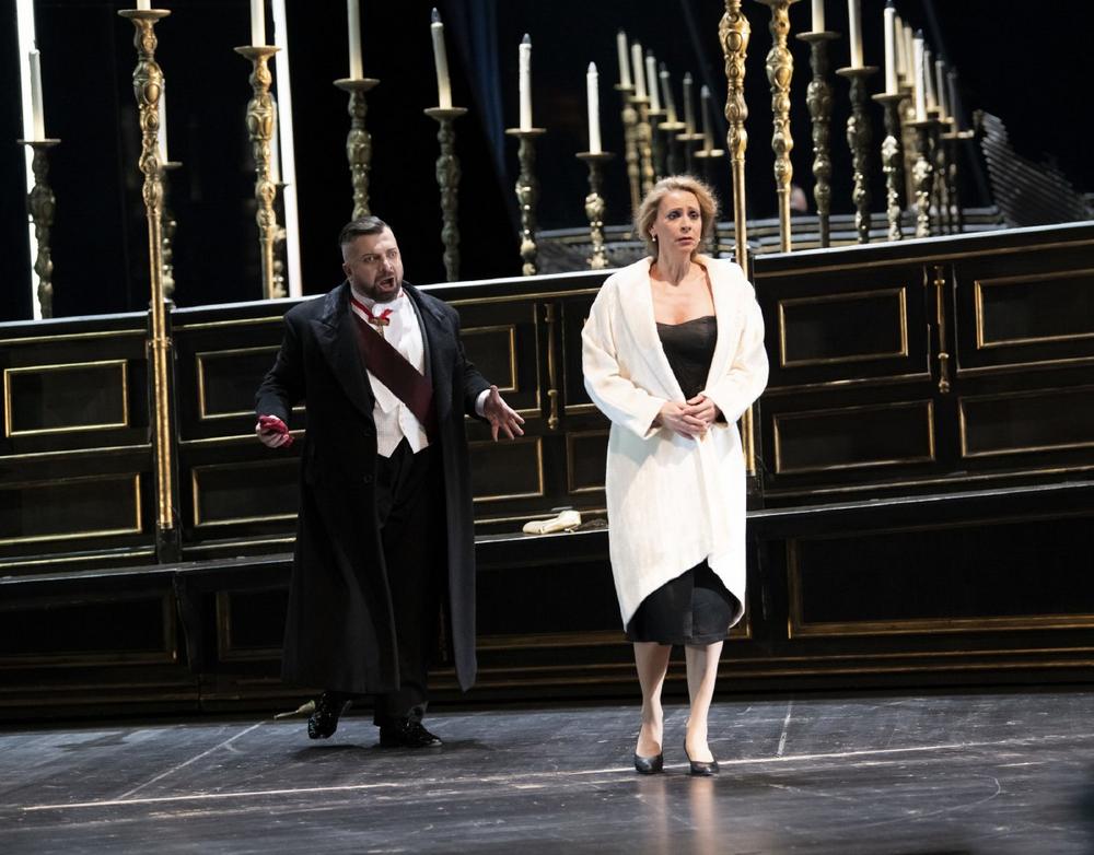 Die Handlung von Puccinis 1900 uraufgeführter „Tosca“ spielt vor dem Hintergrund der politischen Ereignisse in Italien zur Zeit Napoleons: ein atemberaubender Opernkrimi und eine fesselnde Dreiecksgeschichte zugleich. Die Musik schildert einerseits mit drastischen Mitteln Verfolgung, Gier und Folter, zeichnet andererseits ein einfühlsames Charakterbild der Titelheldin. Die Regisseurin Christine Mielitz deutet Puccinis düster-glutvolle Oper als Kommentar zur Konfrontation von Politik, Privatleben und der Rolle des Künstlers. Dabei legt sie das aggressive Potenzial der wuchtigen, geradezu filmischen Musik in beklemmenden Bildern frei.