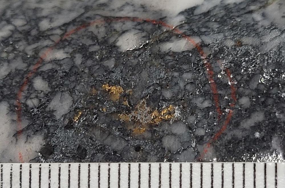 – 0,6 m @ 653,6 g/t AuEq (639,8 g/t Au, 7,3 % Sb) aus 751,8 m - 0,16 m @ 3.352,0 g/t AuEq (3.330,0 g/t Au, 11,7% Sb) aus 776,6 m