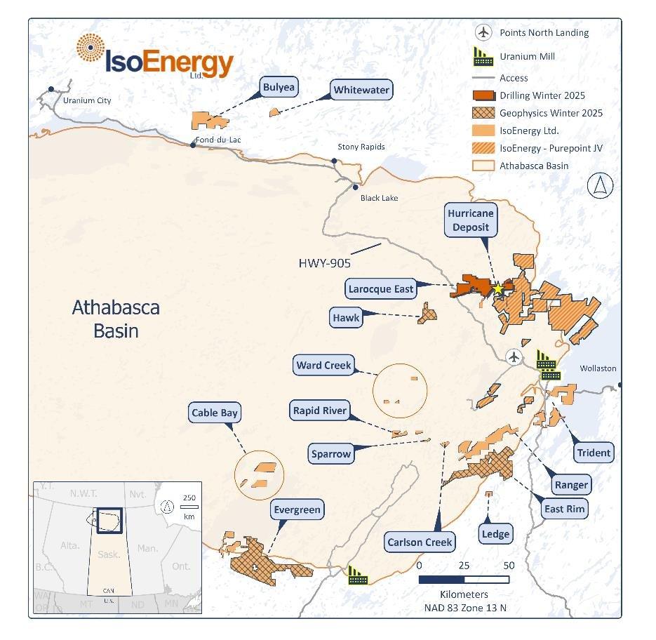 Dan Brisbin, Vice President of Exploration, stated, “We are eager to launch our winter exploration program, which includes testing deposit expansion targets around the margins of the Hurricane deposit and exploring for new deposits along the highly prospective Larocque Trend. Targets on this corridor were identified through a comprehensive integration of drill hole geology, geochemistry, alteration mineralogy, and geophysical data, including electromagnetic, DC resistivity, and ANT surveys. The approach builds on the understanding that Athabasca uranium deposits often consist of multiple zones distributed along trends several kilometres in length, suggesting the potential for additional discoveries beyond the Hurricane deposit. Drilling in the easternmost target areas of the Larocque East project will also enhance our understanding of favourable structural trends extending onto the Turnor Lake project to the east, where our joint venture partner, Purepoint Uranium, is advancing plans for future drilling.”