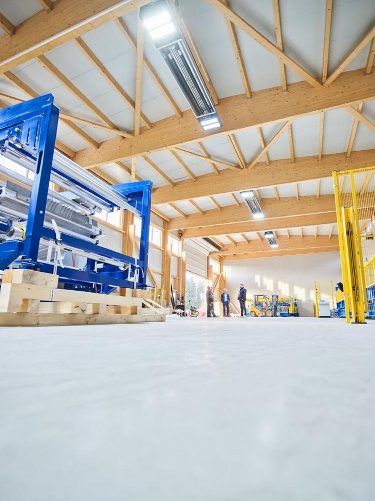 In dem gut isolierten Hallenneubau mit einer Fläche von rund 900 m² und ca. neun Meter Deckenhöhe werden neben der Produktion auch Lagerflächen für Rohstoffe, Maschinenteile und Endprodukte untergebracht werden. Die Frage, welche Anforderungen er an die Beheizung der neuen Halle stellt, beantwortet Christoph Buxbaum so: „Ausschlaggebend waren drei einfache Gründe. Der Neubau ist durch die Behördenauflagen schon rund 350.000 Euro teurer geworden als ursprünglich geplant. Und er ist gut isoliert. Die Heizung war für uns zunächst also eine reine Preissache. Klar war zudem der Energieträger. Etwas Anderes als Strom kam für uns nicht in Frage. Und drittens: Die Heizung sollte bautechnisch einfach sein, ohne großen Aufwand.“ Die Anforderungen, die Christoph Buxbaum formulierte, waren damit schnell auf den Punkt gebracht. Über das Internet informierte er sich über verschiedene Heizungstechnologien. Schließlich war es die Tatsache, dass bereits gute Erfahrungen mit der Infrarottechnologie vorlagen und der Kontakt zum Hallenheizungsspezialisten KÜBLER, der ihn überzeugte.