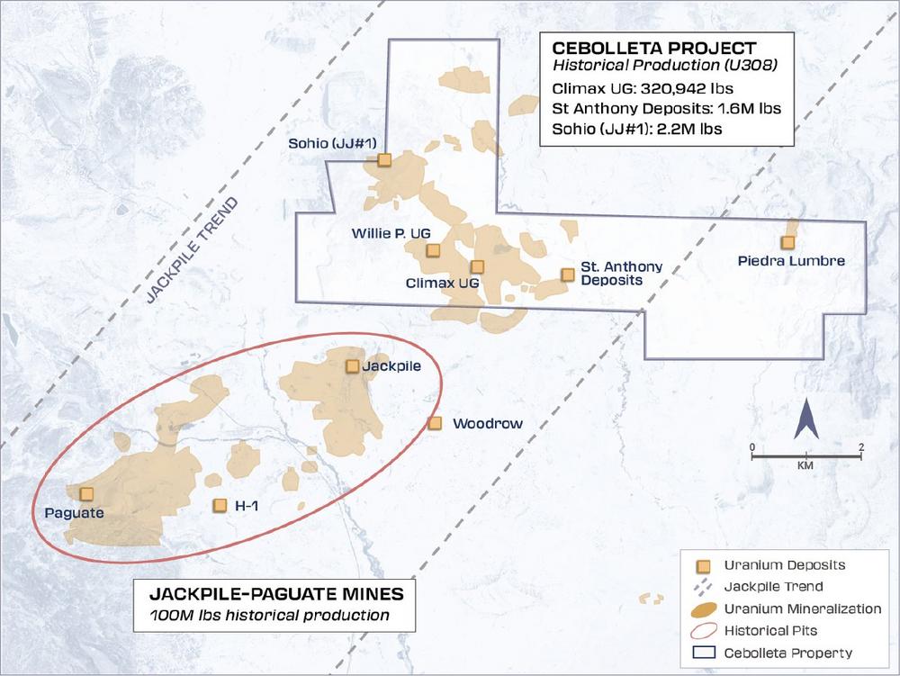The Project has been a cornerstone PUR’s portfolio since its acquisition in 2024. Uranium mineralization at the Project are the northern extension of the Jackpile-Paguate trend of uranium deposits, which is one of the largest sandstone-hosted uranium endowments in the world.[1],[2] Collectively, the mines of the Laguna mining district produced more than 100 million pounds of U3O8 from the Jackpile-Paguate trend during the period from 1951 to 1983, as documented by geologists of the New Mexico Bureau of Geology and Mineral Resources and the US Department of Energy.2 The northern continuation of the Jackpile-Paguate trend of uranium deposits onto the southern part of the Project property is well established, but the extent of mineralization is not fully defined, representing several important potential exploration and growth opportunities for the Company.