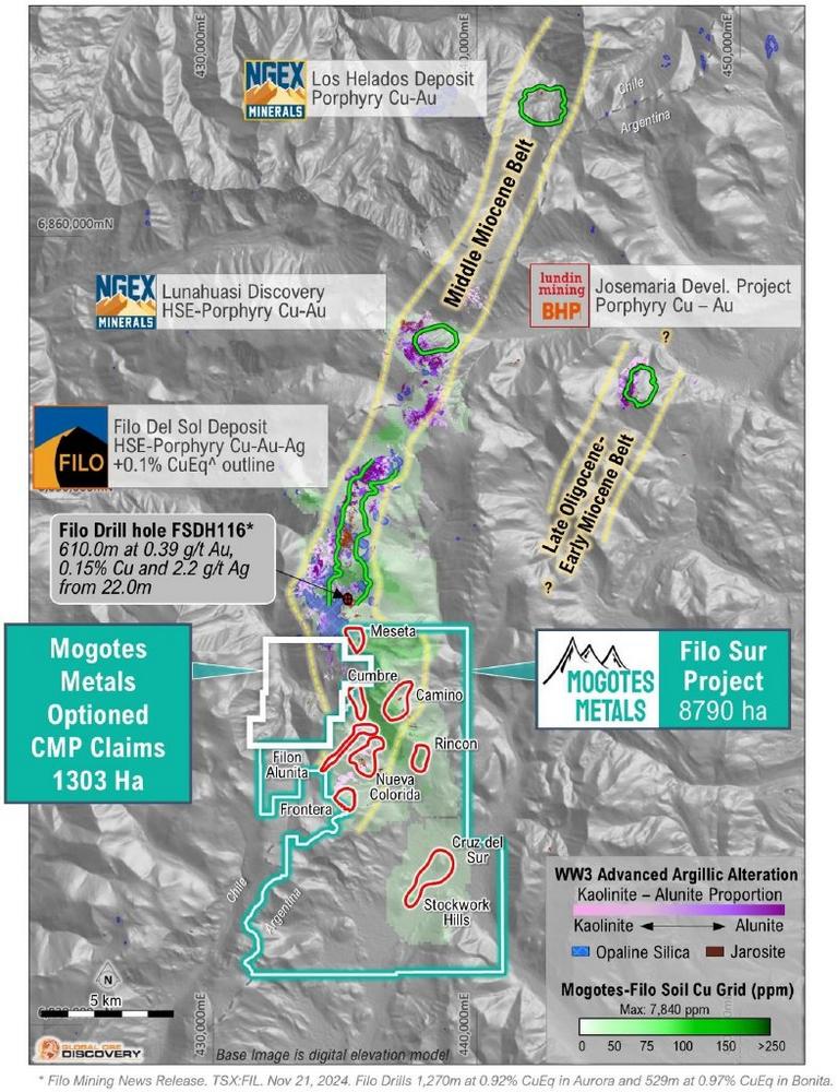 Mogotes has previously reported that the Companies Worldview3 satellite alteration processing that management believes demonstrates advanced argillic / phyllic alteration patterns and large-scale copper in soil anomalies at the Filo Sur project and appear to be continuous with those seen in the adjoining Filo Del Sol trend (TSXV: MOG, July 8, 2024. Vicuña Exploration Update: Filo Sur Project – positive initial results from the New Filon Alunita and Rincon prospects).