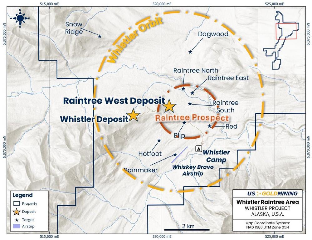 Die Lagerstätte Raintree liegt innerhalb des breiteren ‚Raintree Prospect‘-Gebiets, das neben der Lagerstätte Raintree selbst mehrere Bohrprospekte und Explorationsziele mit einem Durchmesser von 2 km enthält, einschließlich ‚Raintree North‘, ‚Raintree East‘ und ‚Raintree South‘. Im Vergleich zur Lagerstätte Whistler, die über 22.000 Meter an Bohrungen aufweist, umfasst das gesamte Raintree-Prospekt nur 5.190 Meter an historischen Bohrungen. Die bisherige Strategie des Unternehmens bestand darin, sich auf Bestätigungsbohrungen und Studien zu konzentrieren, um den Tagebaubereich der Lagerstätten Whistler und Raintree abzugrenzen und, wo möglich, zu erweitern. Mit Bohrloch WH24-05 hat sich das Unternehmen in ein neues Terran gewagt und einen noch nie zuvor bebohrten Abschnitt des Raintree-Projekts erkundet, um neu identifizierte konzeptionelle Ziele südlich des Tagebaubereichs von Raintree zu testen.