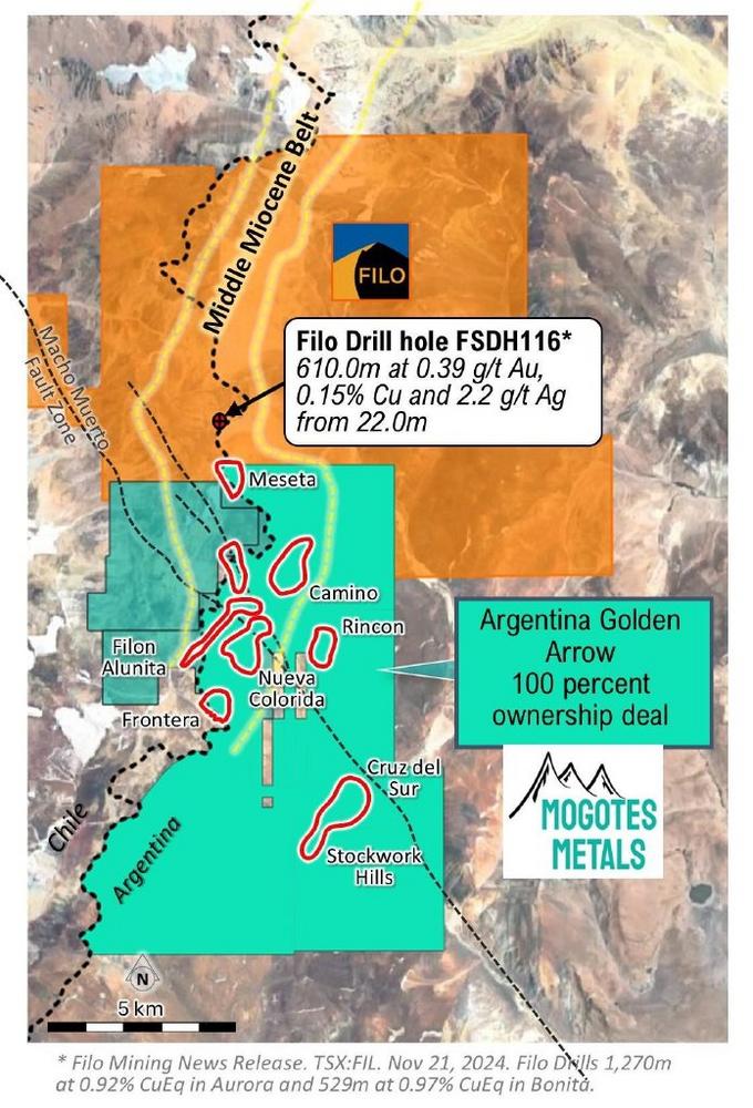 Mogotes Metals Inc. (TSXV: MOG, FSE:AY4) (“Mogotes”, or the “Company”)https://www.commodity-tv.com/… – announces the signing of an agreement with Golden Arrow Resources Corp (“Golden Arrow”) on February 10th, 2025 to amend the previously executed earn-in agreement covering the Argentine land package of Golden Arrow’s Filo Sur project. Under the amended terms, Mogotes has the option to acquire a 100% interest in the project by providing a total of C$1 million (in cash and through a private placement) plus approximately C$3.1 million in Mogotes common shares, of which C$1.5 million is deferred by 12 months, and granting a 1.5% net smelter returns royalty (“NSR”) on the project, of which 0.5% can be repurchased by Mogotes.