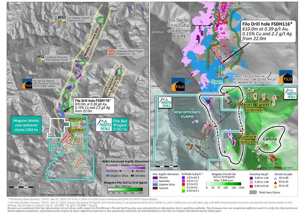 Recent Filo Corp. drilling demonstrates that the Filo Del Sol – Tamberias mineralization remains open to the south on their claims with the recently announced drill hole FSDH116 reporting 610.0m at 0.39 g/t Au, 0.15% Cu and 2.2 g/t Ag from 22.0m, including 58m at 0.94 g/t Au3. This drill hole is located only 1.2 km north of Mogotes Filo Sur property boundary and on trend for the Company’s priority Meseta and Cumbre Targets.