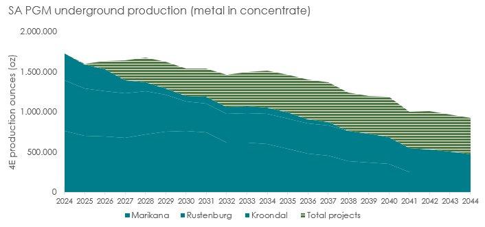 - The chart above reflects the potential proforma production profile for the SA PGM operations, based on the Board-approved ore reserve life of mine (LOM) at 31 December 2023, overlain for illustrative purposes, by potential development and extension projects currently subject to feasibility studies. The current LOM production profile (blue) is based on declared Mineral reserves at 31 December 2023 on a 100% basis, excluding existing tailings reprocessing. Projects represented include the Kroondal depth extension projects, the E4, E3 and Saffy deep brownfields projects. 4E PGM metal price assumptions supporting the proforma production profile include platinum US$923/oz, palladium US$1,055/oz, rhodium US$4,350/oz and gold US$1,925/oz. The Mineral reserves and Mineral resources supplement which provides further detail is available at https://www.sibanyestillwater.com/news-investors/reports/annual/2023/