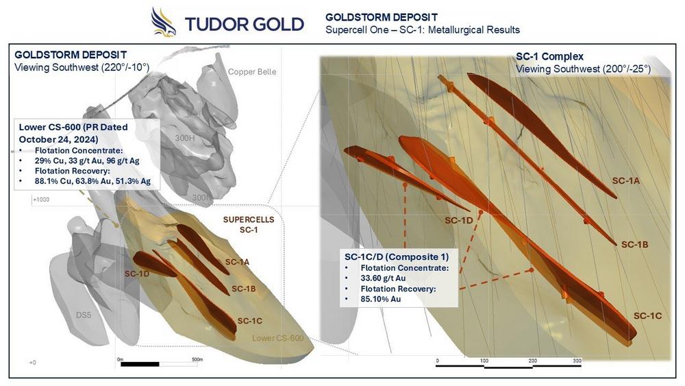 Commenting on the results, Ken Konkin, President & CEO of Tudor Gold stated, " We are very pleased with our preliminary metallurgical test results for two of the SC-1 structures that we believe hold the greatest potential for making a substantial economic impact on the Project. This marks a significant step forward in advancing the exploration and development of the high-grade-gold complex that may lead to the ‘mine within a mine concept’ and represents a pivotal point generating a rejuvenation of a very significant exploration target that could require a much smaller capital cost as a starter area for the Treaty Creek Project. SC-1C is the largest structure, spanning up to 800 meters in length by 400 meters in depth, that we believe can be effectively processed using standard metallurgical technology. All structures are open in all directions. Most importantly, these initial findings demonstrate that a viable gold concentrate could be generated from the largest breccia structures within the Supercell Complex. Additionally, the original hole that intersected SC-1C (GS-22-134) contained 17 grains of fine-grained visible gold, observed over 4.5 meters that averaged 20.61 g/t Au. Of importance to note, was that the values in GS-22-134 had very consistent gold grades with no apparent ‘nugget effect’ that can often occur within these types of systems. Given that we see visible gold in the core, a gravity-flotation system is currently the best choice of beneficiation. However, Tudor’s goal is to optimize and enhance recoveries, and to increase concentrate grades through flotation technology. Further metallurgical studies are also underway on the copper-gold-dominant CS-600 Domain, for which initial metallurgical results were announced on October 24, 2024. The metallurgical study showed that material extracted from the CS-600 copper-gold domain can be processed with conventional flotation techniques to produce a high-quality copper-gold concentrate. Looking forward, the focus in the near term is to continue to investigate the SC-1C and SC-1D mineralized horizons, given that these appear to have the best grade, width and continuity, to develop a multi-million ounce complex analogous to that of the Valley of Kings Deposit at Brucejack Lake. The company is working on permitting for an exploration ramp to best delineate the Supercell structures and test for additional mineralized structures along that vast un-tested upper contact area of the CS-600 Domain.”
