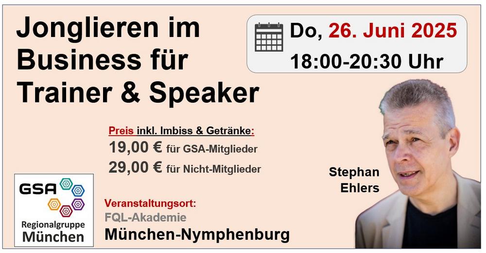 Multitalent Stephan Ehlers hält im wahrsten Sinne des Wortes viele Bälle in der Luft. Er gibt an diesem Abend einen tiefen Einblick in seine knapp 30-jährige Karriere als Trainer, Speaker, Autor und Jongleur. Er hat in dieser Zeit viele namhafte Firmen und Personen um Kreativität, Know-how und Ergebnisse bereichert. Seit 14 Jahren ist Stephan Ehlers Botschafter der GSA Regionalgruppe München und unterstützt GSA-Mitglieder bei der Sichtbarkeit auf Messen oder größeren Events. Hierfür organisiert er seit 2016 die „Lange Nacht der kurzen Reden“, größere Events wie die Impuls-Show mit Gaston Florin, Michael Rossié und Roman Szeliga 2019 im GOP Varieté-Theater sowie GSA-Gemeinschaftsstände für Messen (L&Dpro 2019 + 2020, Personalmesse München 2018 + 2024.