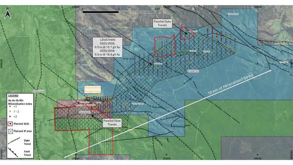 o The IP survey has extended over 12 km2 and covers 6 km strike (of the 12 km) of the dyke and altered sediment hosted gold mineralized trend to cover significant historical mining areas including Tonstal, Leviathan, Consols and Aftermath. Parallel dyke trends have also been tested. Analysis and interpretation are now ongoing and further results will be released once complete.