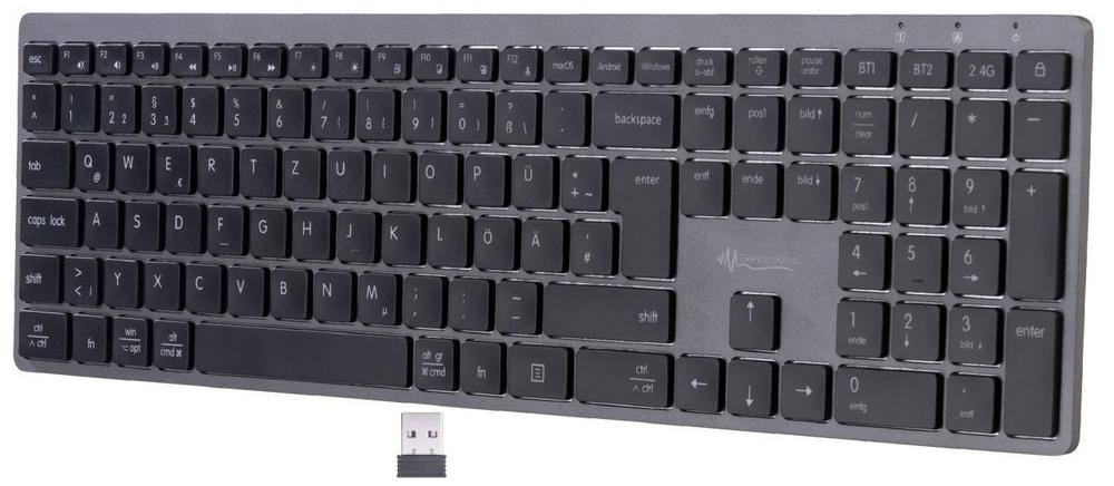 Die kabellose Multi-Device-Akkutastatur von GeneralKeys überzeugt durch kabellose Vielseitigkeit und die Möglichkeit, bis zu drei Geräte über Bluetooth 5.1 oder 2,4 GHz Funk zu koppeln. Das spritzwassergeschützte QWERTZ-Layout mit Nummernblock und reaktionsschnellen, geräuscharmen Scissor-Tasten bietet hohen Tippkomfort im Büro oder Home-Office. Der integrierte 500 mAh Akku sorgt für eine Laufzeit von bis zu 125 Stunden und lässt sich bequem über USB-C aufladen. Mit einem Gewicht von nur 520 Gramm und einer Reichweite von bis zu 10 Metern ist die Tastatur flexibel einsetzbar und mit Windows, macOS, Android und iOS kompatibel.