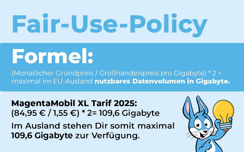 Handyhase.de hat dies an einer Beispielrechnung visualisiert, und zwar anhand des MagentaMobil-XL-Tarifs der Telekom. Dieser hat im Inland unbegrenztes Datenvolumen. Auf Basis der Grundgebühr von 84,95 Euro im Monat ergeben sich rund 110 Gigabyte für den Verbrauch im EU-Ausland.