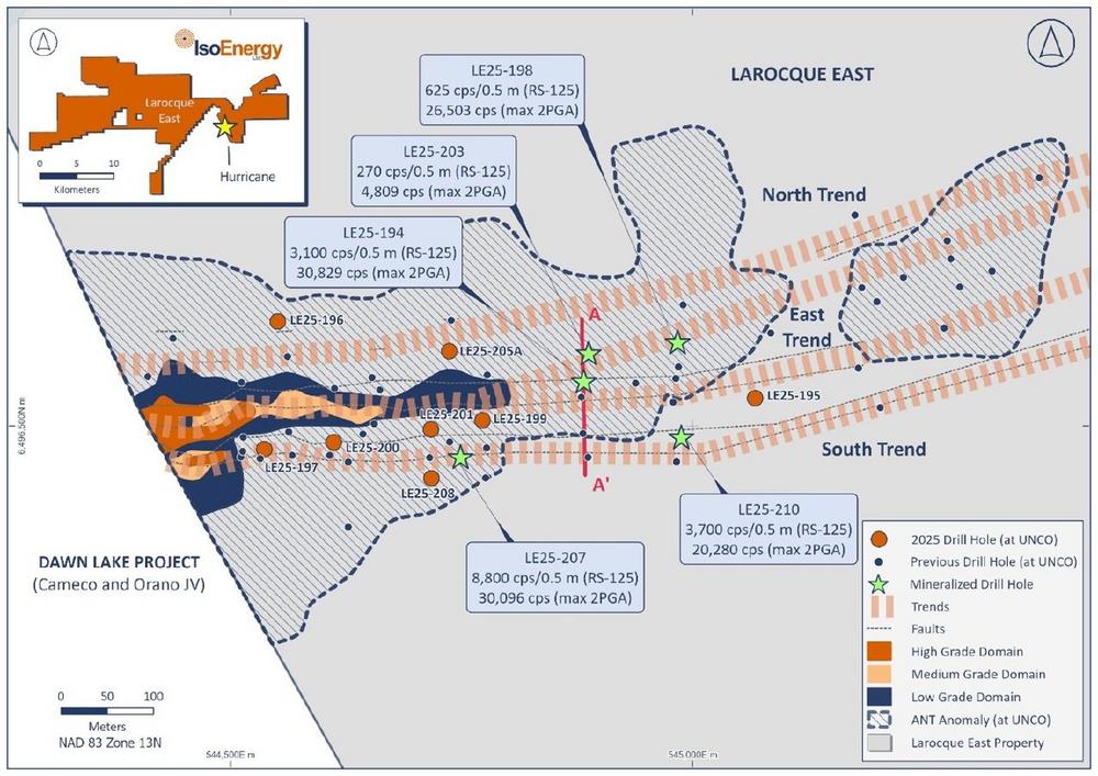 • South Trend – Drilling along the projected extension of the J and K faults intersected strong radioactivity, confirming potential continuity east of Hurricane. Hole LE25-207, located 240 m east of Hurricane, returned an average RS-125 reading on over 0.5 m on core of 8,800 cps and a corresponding downhole probe maximum reading of 30,096 cps, while LE25-210, drilled 480 m east of Hurricane, intersected up to 3,700 cps averaged over 0.5 m on core and a corresponding downhole probe maximum reading of 20,280 cps.