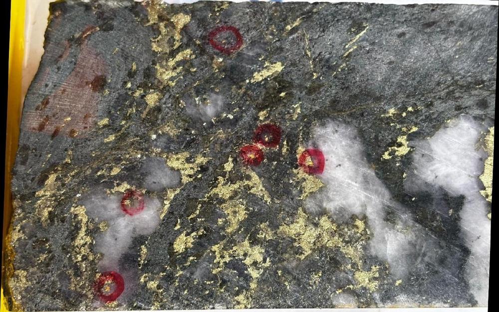 CD-654 was drilled in a shallow sector of the Eastern Copper Zone (“ECZ”) with historical workings (“Figure 1”) and successfully drilled a projected down-dip extension of high-grade Au-Cu ore. Returning 9.9m @ 14.8g/t AuEq (11.0% CuEq) (14.4g/t Au, 0.6% Cu & 2.7g/t Ag) from 29.3m, including 1.9m @ 71.4g/t AuEq (53.1% CuEq) (72.5g/t Au, 0.9% Cu & 4.3g/t Ag) from 30.1m. This included a higher-grade Au vein set grading 276 g/t Au over 0.46m (Photo 1) with visible gold. Locally this extension had lacked drilling, lowering the modelled grade despite being adjacent to a zone where higher-grade gold and copper was historically mined. Consequently, CD-654 has corrected this, and additional drilling is being reviewed to test for dip / plunge projections of this high-grade trend.