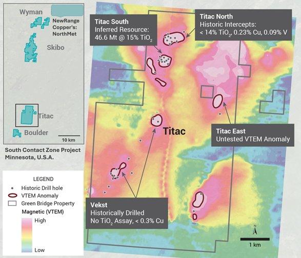 "Die ersten Ergebnisse der VTEM™-Untersuchung bei Titac sind sehr ermutigend, insbesondere vor dem Hintergrund positiver Ankündigungen für die Zukunft des Bergbaus in den USA und Minnesota. Wir freuen uns, dass das benachbarte NewRange-Projekt namens NorthMet in die Liste der FAST-41-Transparenzprojekte aufgenommen wurde, die einen beschleunigten Genehmigungszeitplan für die aufgeführten Bergbauprojekte vorsieht. In unserer South Contact Zone, etwa 45 km vom Grundstück NewRange NorthMet entfernt, hat Green Bridge nun eine beträchtliche Anzahl an magnetischen Anomalien beschrieben, die in ihrer geophysikalischen Signatur der zuvor abgegrenzten Titanressource ähnlich zu sein scheinen (siehe Pressemitteilung vom 3. Oktober, 2024 und den technischen Bericht mit dem Titel "TECHNICAL REPORT AND MINERAL RESOURCE ESTIMATE FOR THE SOUTH CONTACT ZONE PROJECT, ST LOUIS COUNTY, MINNESOTA, USA" ("Technischer Bericht"), der im Profil des Unternehmens unter www.sedarplus.ca). Während der anfängliche Plan darin besteht, Infill-Maßnahmen bei Titac South durchzuführen und die Erschließung bei Titac North fortzusetzen, ist es aufregend, ein Gebiet in Bezirksgröße zu erkunden, das ein hervorragendes Potenzial aufweist. "