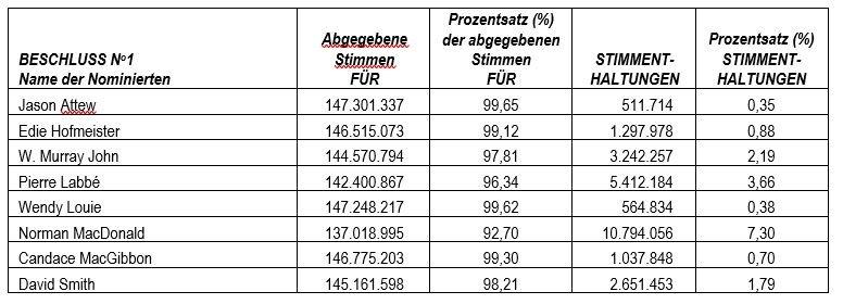 Das Unternehmen gibt außerdem bekannt, dass alle acht (8) Kandidaten, die in dem am 8. April 2025 bei den Aufsichtsbehörden eingereichten Management-Informationsrundschreiben aufgeführt sind, zu Direktoren des Unternehmens gewählt wurden. Auf der Versammlung waren 155.758.846 Stammaktien anwesend oder vertreten, was 83,29 % der 187.007.157 Stammaktien entspricht, die am 21. März 2025, dem Stichtag für die Versammlung, ausgegeben und in Umlauf waren.