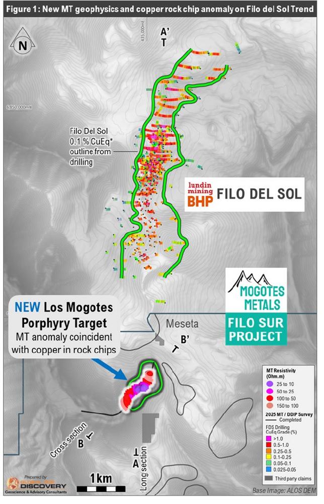 - More geophysics to come. These results are from the initial processing of the first line (L2), of a 4 line survey totalling 10.7 line km of Deep IP/MT (DDIP/MT) and additional wide spaced infill Vector IP/MT (VIP/MT) that define Mogotes 2025 geophysical program focused on the Company’s recently optioned Chile claims. The Survey was designed to also test the Meseta, Cumbre and new Cuenca targets. Results from the initial processing of the additional geophysics will be reported over the coming weeks. Mogotes has use the Southern Rock Geophysics proprietary 3D VIP/MT system to survey the Chilean and Argentine sections of the Filo Sur project in 2023. The application of the sample technology and survey parameters will allow integrated 3D processing of the 2023 and 2025 surveys to build a 3D model of the whole project for target selection and prioritising for drill testing.