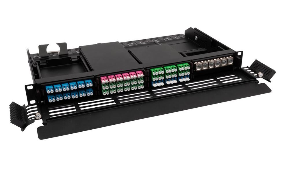 - Modulgrößen: ⅓ HE (bis zu 144 Fasern), ½ HE (bis zu 96 Fasern), 1 HE (bis zu 24 RJ45-Ports)