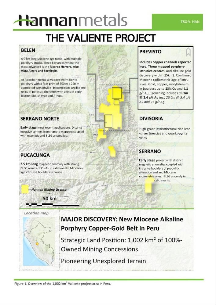 Im Jahr 2021 hat Hannan 1.002 km2 an Bergbaukonzessionen bei Valiente abgesteckt, die sich zu 100 % in seinem Besitz befinden und unerforschtes Terrain für potenzielle mineralisierte Porphyrziele im zentralen Osten Perus abdecken. Das Projekt Valiente hat sich rasch von einem "Greenfield"-Projekt zu einer vielversprechenden Gelegenheit entwickelt.