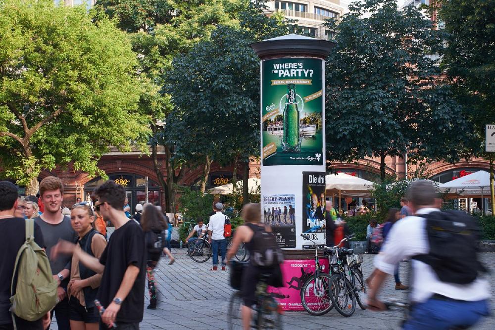 Ihre auffallende Form und hohe Präsenz tragen wesentlich zur Vertrautheit der Menschen mit der Litfaßsäule bei. So gibt jede/jeder zweite an, auf den täglichen Wegen außer Haus mindestens fünf Mal an einer solchen Säule vorbeizukommen. In den jüngeren Zielgruppen und in Großstädten ist die Kontakthäufigkeit noch ausgeprägter. Dabei wird sie in hohem Maß als Medium der Innenstädte und Fußgängerzonen wahrgenommen, zugleich bestätigen rund 70 Prozent der Befragten aber auch, die Säule stehe „eigentlich überall in der Stadt.“