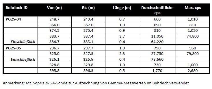 - Die Radioaktivitätswerte der Bohrlochsondenmessungen betrugen durchschnittlich 11.050 cps auf 3,7 Metern mit einem Maximum von 74.800 in PG25-04 und 27.750 cps auf 2,3 Metern mit einem Maximum von 79.800 in PG25-05 (siehe Tabelle 1 für weitere Details).