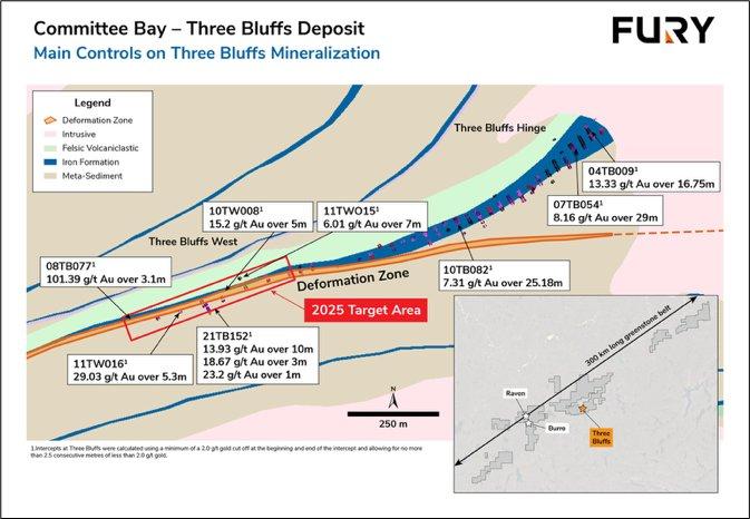 The high-grade Three Bluffs Gold deposit is located centrally within the project and is estimated to contain 524,000 oz. of gold in 2.1 million tonnes (Mt) at 7.85 g/t gold in the indicated mineral resource category and 720,000 oz. in 2.9Mt of gold at 7.64 g/t gold in the inferred mineral resource category (see Committee Bay NI43-101 report “Technical Report on the Committee Bay Project, Nunavut Territory, Canada” dated September 11, 2023”). Drilling in 2021 at Three Bluffs intercepted 3 zones of mineralization: 13.93 g/t gold over 10 m; 18.67 g/t gold over 3 m; and 23.2 g/t gold over 1 m (see News Release dated December 1, 2021). The first two noted intercepts occur outside of the main iron formation in sheared metasediments. The shear hosted mineralization runs sub-parallel to the main iron formation (Figure 1) and has not been previously targeted. The 2021 intercepts are approximately 250 m below surface and remain open up dip, down dip, as well as along strike in both directions. Drilling in 2025 will target the sub-parallel shear zone as well as the iron formation itself with five to six step-outs from the 2021 intercept for 2,750m of drilling (Figure 2).
