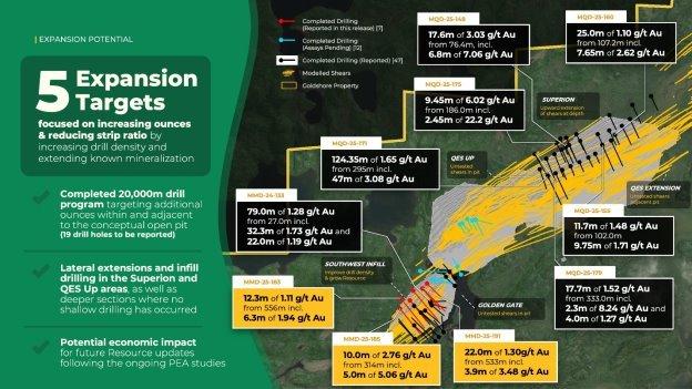 Die jüngsten Bohrungen in der Zone Southwest konzentrierten sich auf die Auffüllung des spärlich bebohrten Gebiets zwischen dem aktuellen konzeptionellen Tagebau der MRE und den hochgradigen Abschnitten, die bis zu 175 m weiter unten angetroffen wurden, einschließlich der zuvor veröffentlichten mineralisierten Abschnitte von 39,75 m mit 1,18 g/t Au ab 440,25 m, einschließlich 14,60 m mit 2,65 g/t Au ab 462.2 m in MMD-22-023 (10. August 2022), 23,0 m mit 1,92 g/t Au ab 514,0 m, einschließlich 1,55 m mit 22,9 g/t Au ab 514,0 m in MMD-22-25 (6. Juni 2022), 20,55 m mit 2,58 g/t Au ab 458.15 m, einschließlich 14,7 m mit 3,52 g/t Au in MMD-24-139 (20. Februar 2025), und 15,0 m mit 1,68 g/t Au ab 456 m, einschließlich 3,0 m mit 3,19 g/t Au ab 458,0 m in MMD-25-140 (20. März 2025).