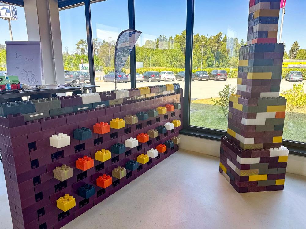 Das sogenannte SKZ-Bausteinwerkzeug kam bei Spritzgießversuchen mit Post-Consumer-Recycling-Materialien (PCR) der Firma WildPlastic in Kombination mit dem Schaumspritzgießverfahren Cellmould von Wittmann zum Einsatz. Unter dem Motto „Einfach machen“ wurde das Potenzial nachhaltiger Materialien demonstriert. Dabei wurde Kunststoffabfall, der weltweit vor Ort gesammelt wurde, auf einer Cellmould-Spritzgießmaschine zu Bausteinen verarbeitet. Kunststoffabfall entstand bei den Versuchen keiner, da die Bausteine begehrte Objekte für alle Altersklassen sind.