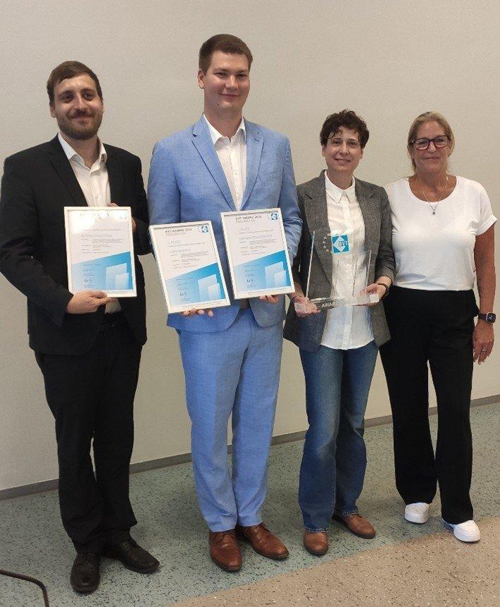 Voller Freude hatte Annette Stensitzky, Geschäftsführerin des BVT, den Pokal für die Schule und die Urkunden für die Projektanten überreicht. Die Projektanten Jan Marten Förster, Björn Hagström und Lars Morich (er konnte krankheitsbedingt nicht teilnehmen) konnten mit ihrer Projektarbeit „Entwicklung und Konstruktion einer elektropneumatischen und teilautomatisierten Flachbandschleifmaschine zur Bearbeitung von mehrfachgespannten NiRo Werkstücken“ die Fachjury überzeugen. Ihr Preisgeld in Höhe von 500,00 € hatten sie bereits vor der Veranstaltung erhalten. Herr Barnet, der Projektbetreuer, der mit einer Klasse in Sevilla unterwegs war, wurde per Video zu den Feierlichkeiten zugeschaltet, um bei dem freudigen Ereignis dabei sein zu können. Bereits zum 9. Mal konnte eine Projektarbeit der Fachschule aus Hildesheim überzeugen und belegte einen Platz unter den besten Drei.