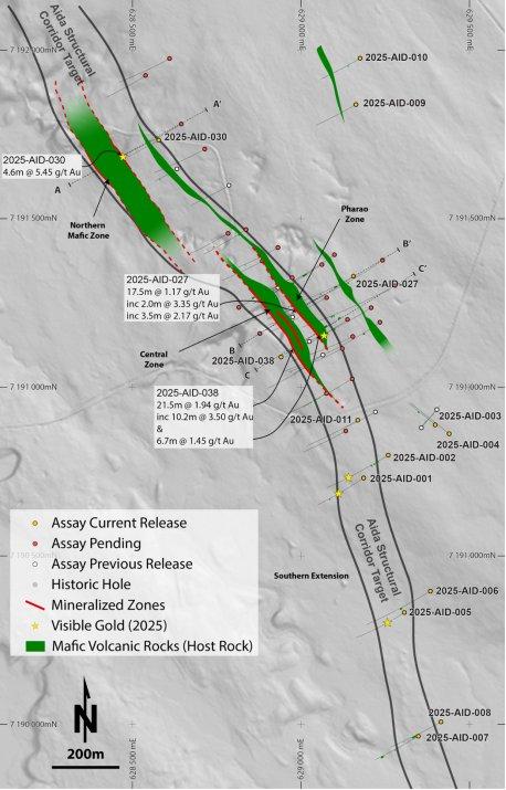 - Mehrere ausgeprägte Goldabschnitte durchteuft, einschließlich 1,94 g/t Au auf 21,5 m (2025-AID-038), 5,45 g/t Au auf 4,6 m (2025-AID-030) und 1,17 g/t Au auf 17,5 m (2025-AID-027)