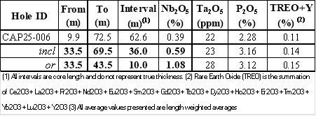 Die vorläufigen visuellen Ergebnisse aus Bohrloch CAP25-006 aus der Kampagne 2025 veranlassten das Unternehmen, beim Untersuchungslabor einen Eilauftrag für die Ergebnisse aus den oberen 72,5 Metern („m“) aufzugeben. Die Ergebnisse bestätigen eine starke Niob-Mineralisierung, die bei 33,5 m bohrlochabwärts beginnt und sich über 36 m mit 0,59 % Nb₂O₅ erstreckt, einschließlich einer höhergradigen Zone von 10 m mit einem durchschnittlichen Gehalt von 1,08 % Nb₂O₅ (siehe Tabelle 1, Abbildung 1). Diese Ergebnisse validieren die deutlichen visuellen Einschätzungen der Pyrochlor-Mineralisierung (Abbildung 2), die das Unternehmen in seiner Pressemitteilung vom 12. August veröffentlichte, und veranschaulichen das Potenzial für den Erzgehalt über eine beträchtliche Mächtigkeit in der Tiefe, wo das Zentrum des mineralisierten Systems noch nicht erkundet wurde.