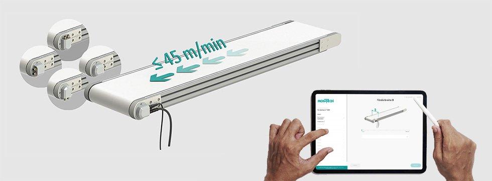 Zusätzlich zum verbesserten Anschlusslayout hat Montech das Antriebssortiment des Förderbands TB40 um eine dritte Getriebeoption erweitert. Diese ist ideal für Anwendungen mit geringeren Lasten, aber höheren Fördergeschwindigkeiten. Neu sind Fördergeschwindigkeiten von 10 bis 45 m/min bei einer maximalen Förderlast von 50 kg möglich. Sie ergänzt die beiden bestehenden Getriebeversionen optimal; eine fördert Lasten bis zu 80 kg mit einer Fördergeschwindigkeit von 1 bis 33,5 m/min, die andere Lasten bis zu 200 kg mit einer Fördergeschwindigkeit von 0,25 bis 12 m/min. Durch diese gezielten Anpassungen bietet das Förderband TB40 neu eine noch flexiblere Lösung für verschiedene Förderanforderungen und erhöht gleichzeitig die Betriebssicherheit.