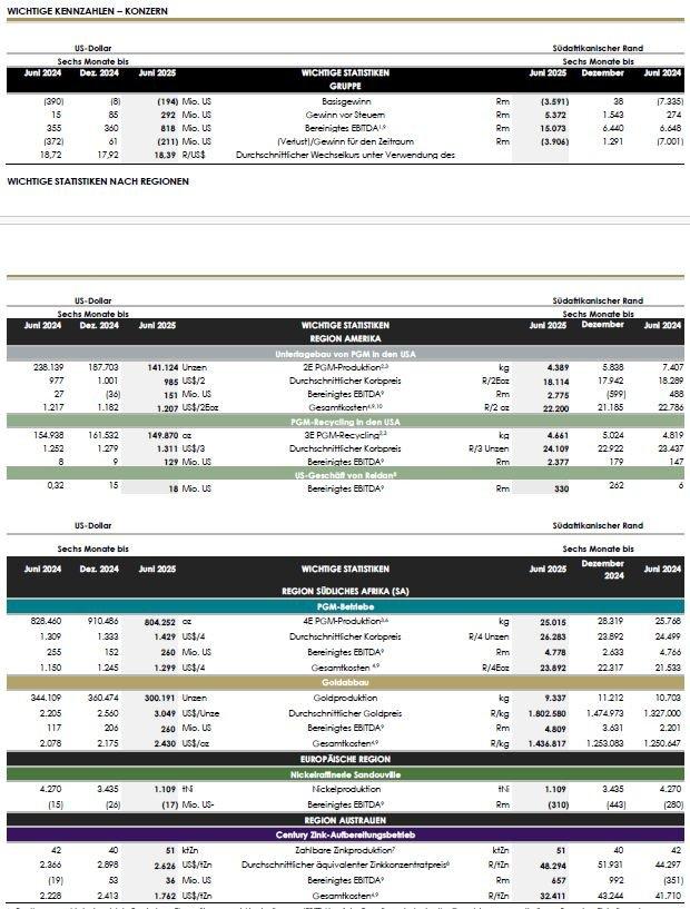 Diese Kurzmeldung liegt in der Verantwortung des Verwaltungsrats der Gesellschaft (Verwaltungsrat). Die offengelegten Informationen sind nur eine Zusammenfassung und enthalten keine vollständigen oder umfassenden Details. Alle Anlageentscheidungen von Anlegern und/oder Aktionären sollten auf der Grundlage einer Prüfung der vollständigen Finanzergebnisse für das am 30. Juni 2025 endende Halbjahr (Ergebnisbroschüre) unter getroffen werden. Aktionäre werden gebeten, die Ergebnisbroschüre zu lesen, die auf der Website des Unternehmens unter https://www.sibanyestillwater.com/… und über die JSE unter https://senspdf.jse.co.za/… eingesehen werden kann