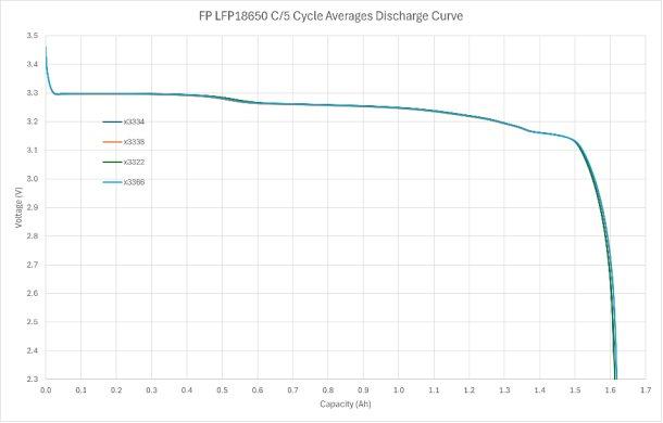 Die PHOS–LFP-18650-Batteriezellen wurden im Hinblick auf ihre Kapazität getestet, indem sie mit einer typischen Stromstärke von C/5 entladen wurden. Die vorstehende Grafik zu vier der getesteten Batteriezellen zeigt eine konsistente Kapazität von etwas mehr als 1,6 Ah, was mit anderen ähnlichen handelsüblichen LFP-Batterien mit 18650er Zellen übereinstimmt.