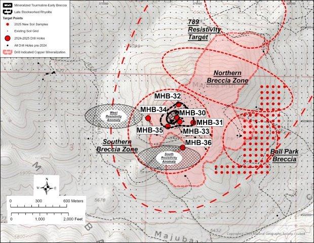 Das Kernbohrloch MHB-36 wurde von Exploration Technologies, Inc. („ExploreTech“) mittels seines eigenen KI-gestützten geophysikalischen Modellierungssystems geplant, um eine Resistivitätsanomalie mit hohem Potenzial im Brekzienkorridor der Southern Zone im Projektgebiet Majuba Hill zu erproben. Der KI-gestützte Ansatz zur Zielbestimmung strebte an, die geologisch günstigen Zonen mit einem Potenzial für eine Kupfermineralisierung über die bereits bekannten Zonen hinaus zu identifizieren.